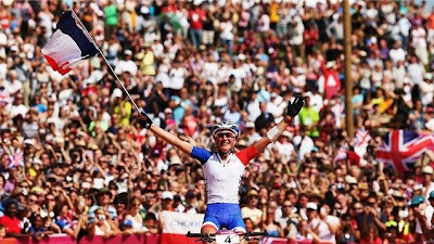 | Julie Bresset after winning gold in the mountain bike competition. Image from imgace.com |